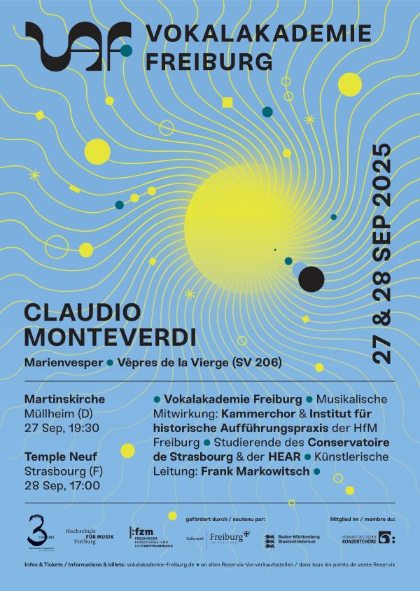 Eines der bekanntesten Werke der Chormusikgeschichte führen die Sängerinnen und Sänger der Vokalakademie Freiburg in Kooperation mit CHŒUR3, der Internationalen Chorakademie im Dreiländereck, dem Kammerchor der Hochschule für Musik Freiburg sowie dem Institut für Historische Aufführungspraxis der HfM Freiburg auf: die Marienvesper von Claudio Monteverdi. Ebenfalls an dem Projekt beteiligt sind das Freiburger Forschungs- und Lehrzentrum Musik (FZM) sowie die Gesangsabteilung des Conservatoire de Strasbourg.